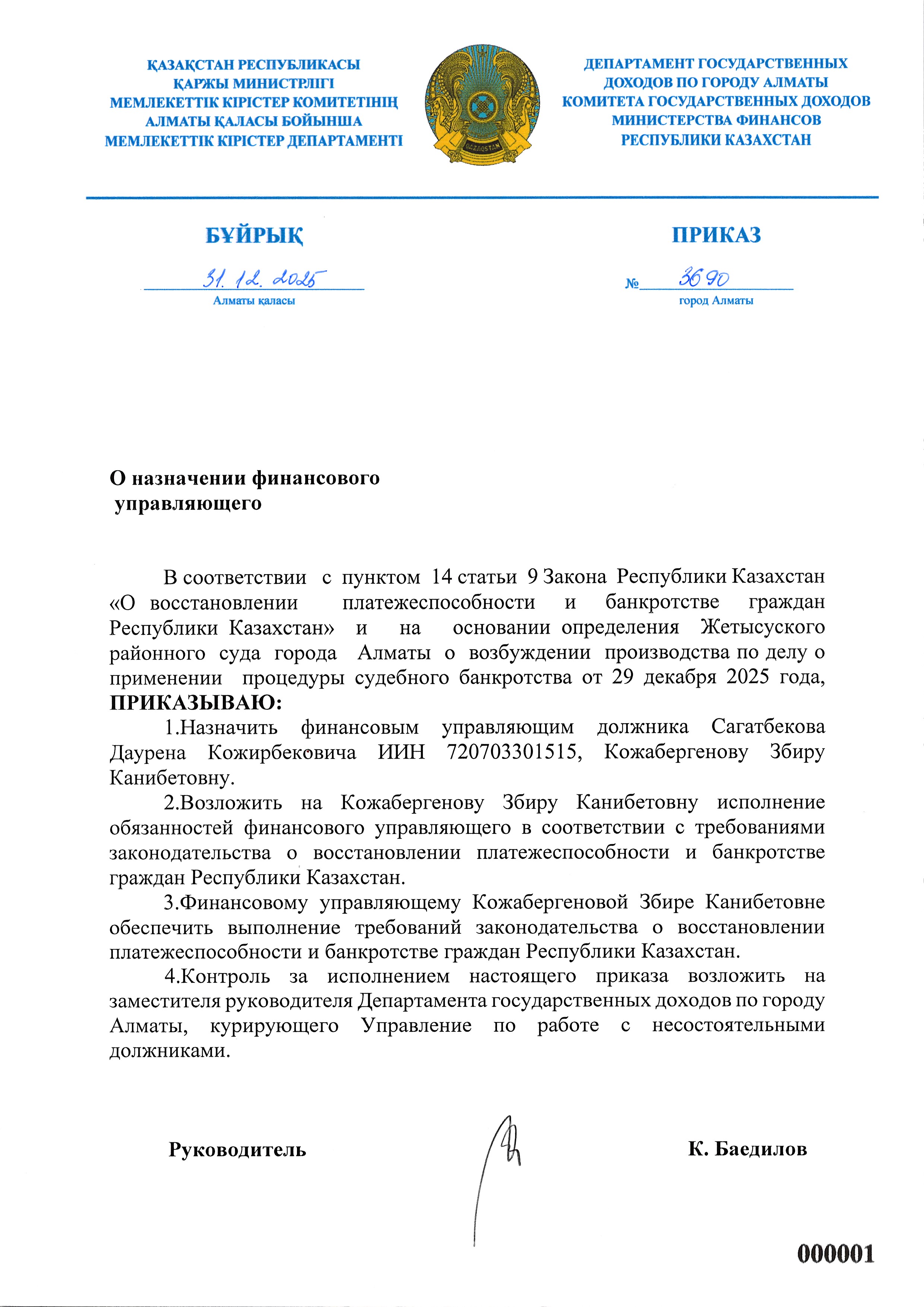 Приказ о назначении финансового управляющего по заявлению должника Сагатбеков Даурен