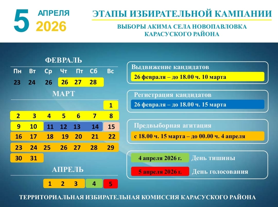 Выборы акима села Новопавловка Карасуского района Костанайской области 5 апреля 2026 года
