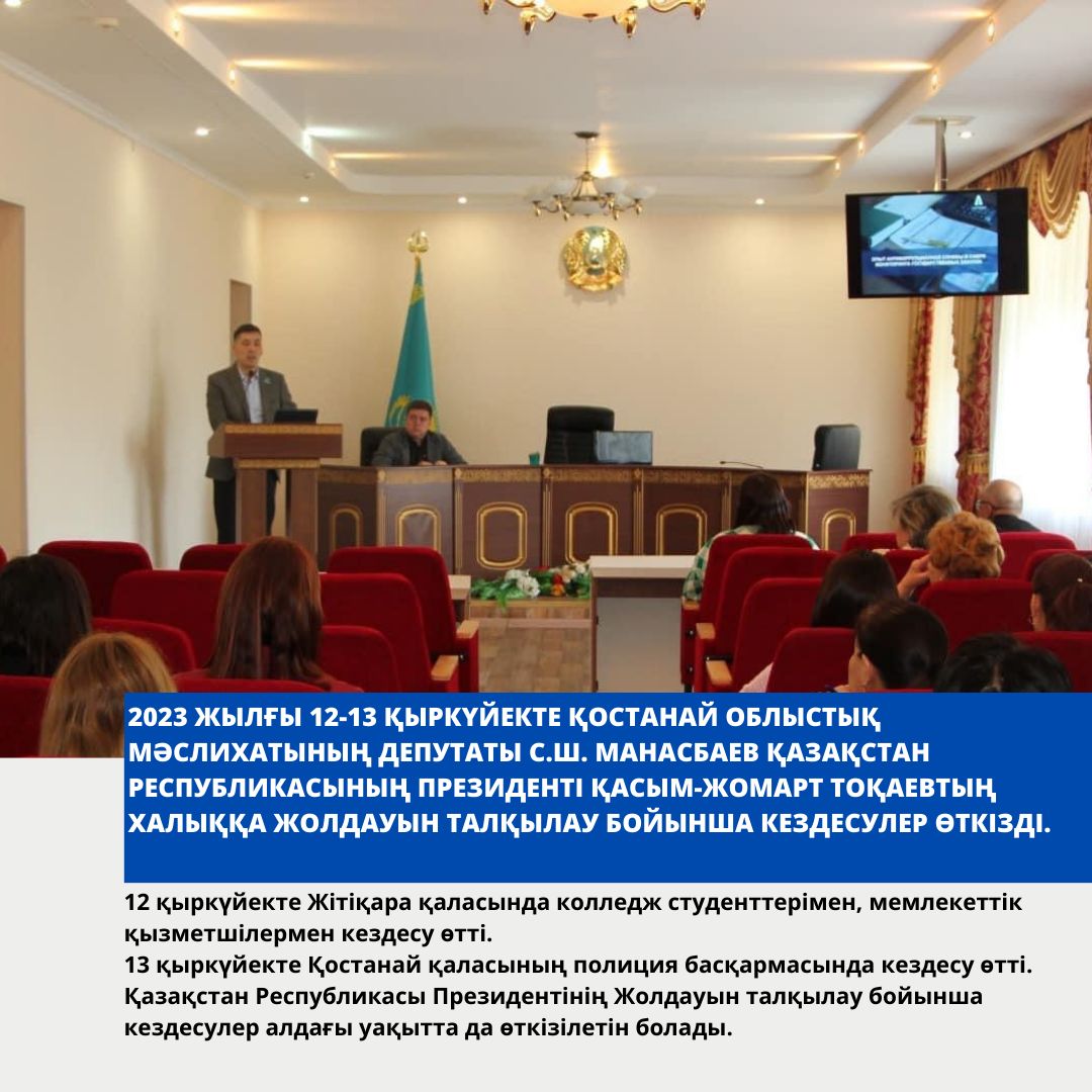2023 жылғы 12-13 қыркүйекте Қостанай облыстық мәслихатының депутаты С.Ш. Манасбаев Қазақстан Республикасының Президенті Қасым-Жомарт Тоқаевтың халыққа Жолдауын талқылау бойынша кездесулер өткізді.