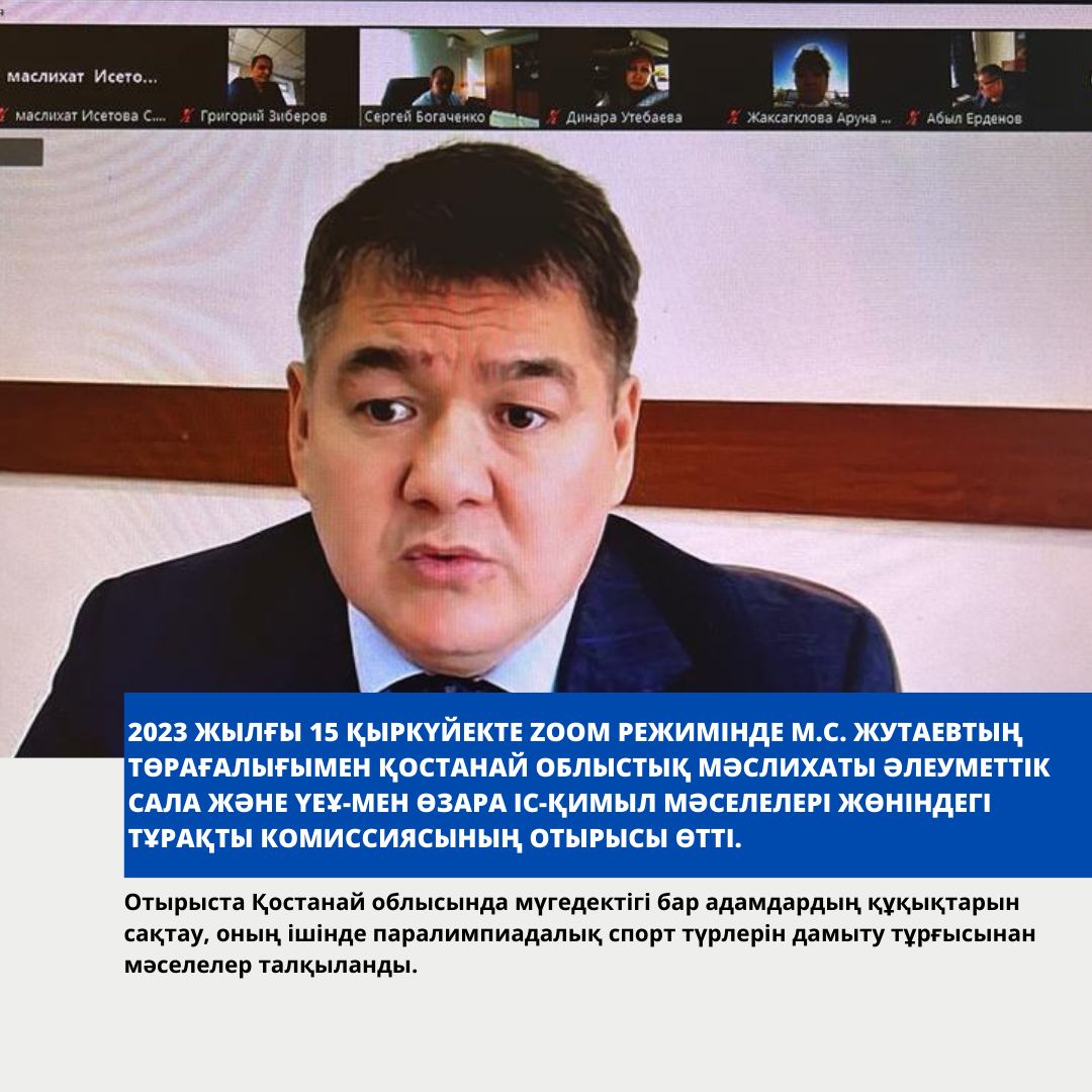 2023 жылғы 15 қыркүйекте ZOOM режимінде М.С. Жутаевтың төрағалығымен Қостанай облыстық мәслихаты әлеуметтік сала және ҮЕҰ-мен өзара іс-қимыл мәселелері жөніндегі тұрақты комиссиясының отырысы өтті.