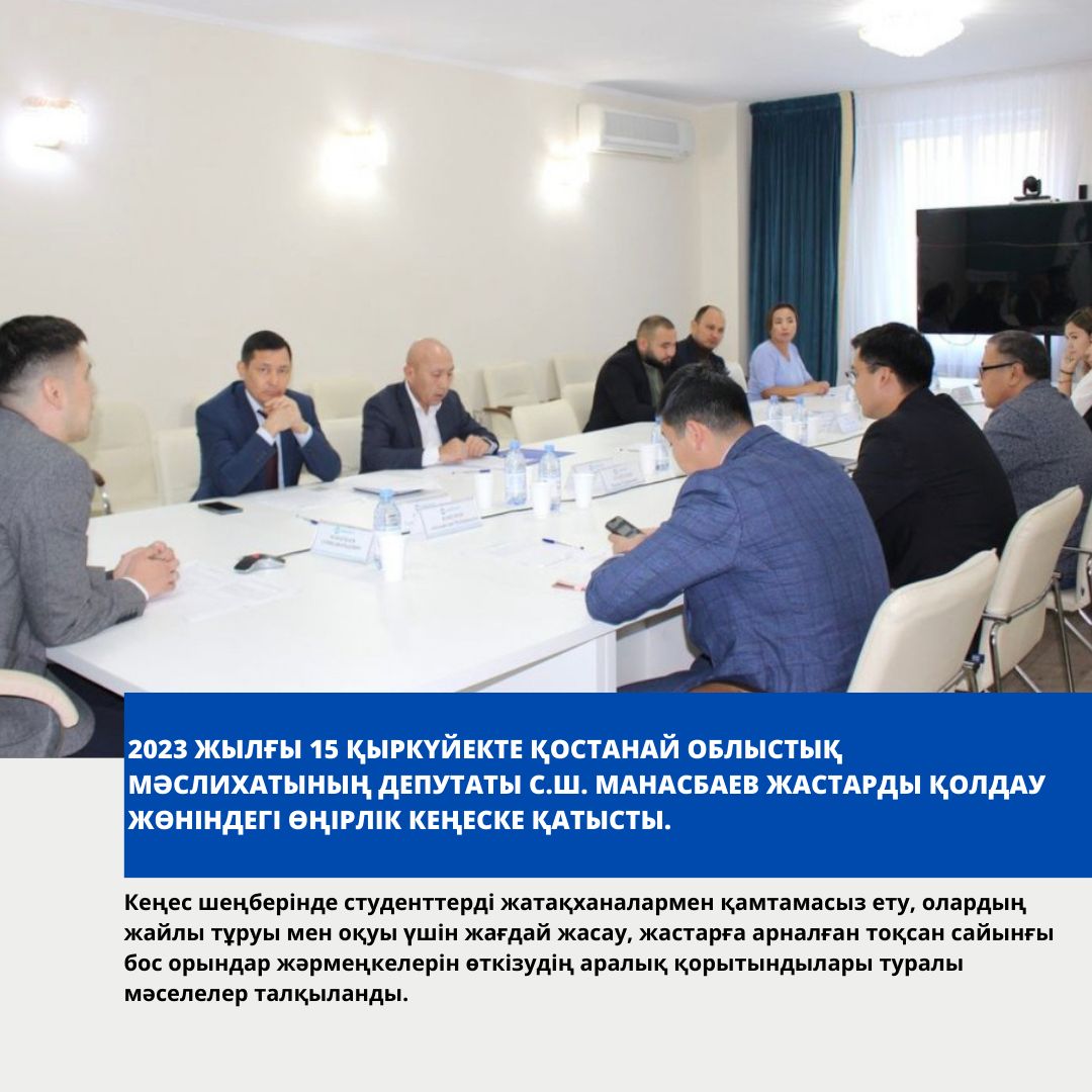 2023 жылғы 15 қыркүйекте Қостанай облыстық мәслихатының депутаты С.Ш. Манасбаев Жастарды қолдау жөніндегі өңірлік кеңеске қатысты.