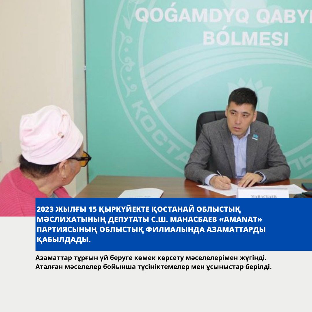 2023 жылғы 15 қыркүйекте Қостанай облыстық мәслихатының депутаты С.Ш. Манасбаев «AMANAT» партиясының облыстық филиалында азаматтарды қабылдады.