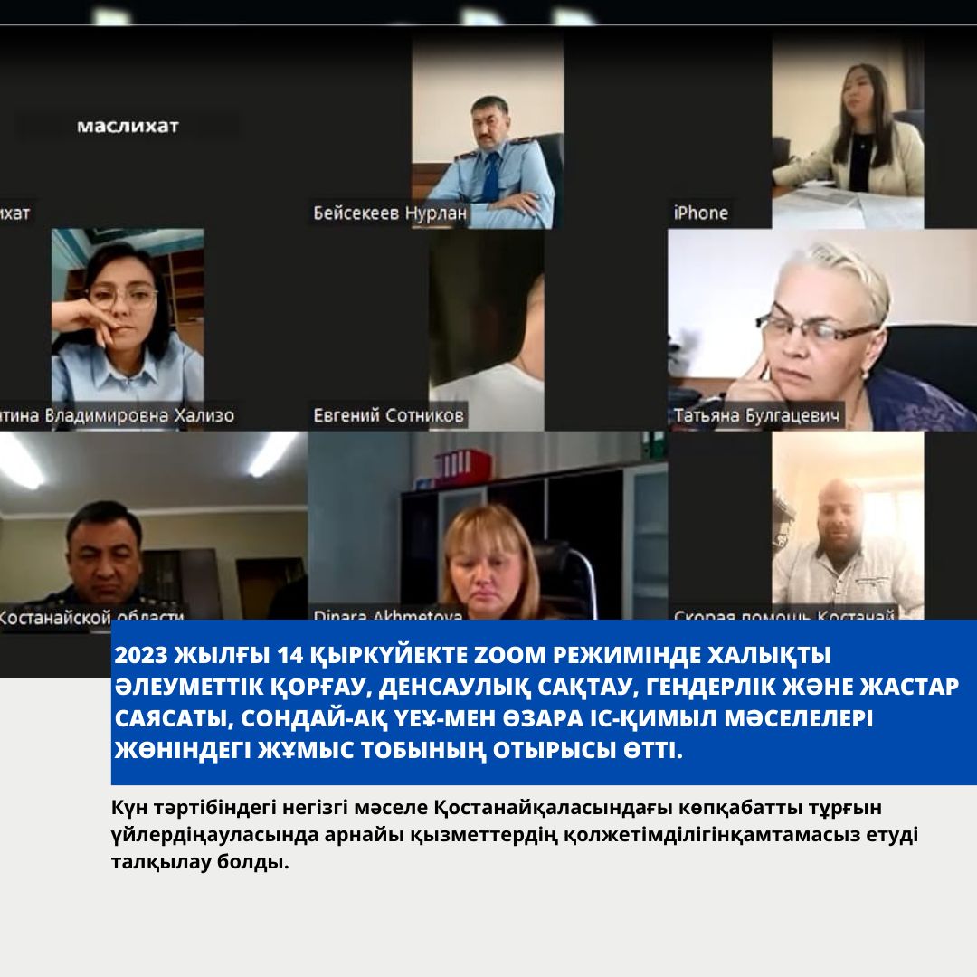 2023 жылғы 14 қыркүйекте ZOOM режимінде халықты әлеуметтік қорғау, денсаулық сақтау, гендерлік және жастар саясаты, сондай-ақ ҮЕҰ-мен өзара іс-қимыл мәселелері жөніндегі жұмыс тобының отырысы өтті.