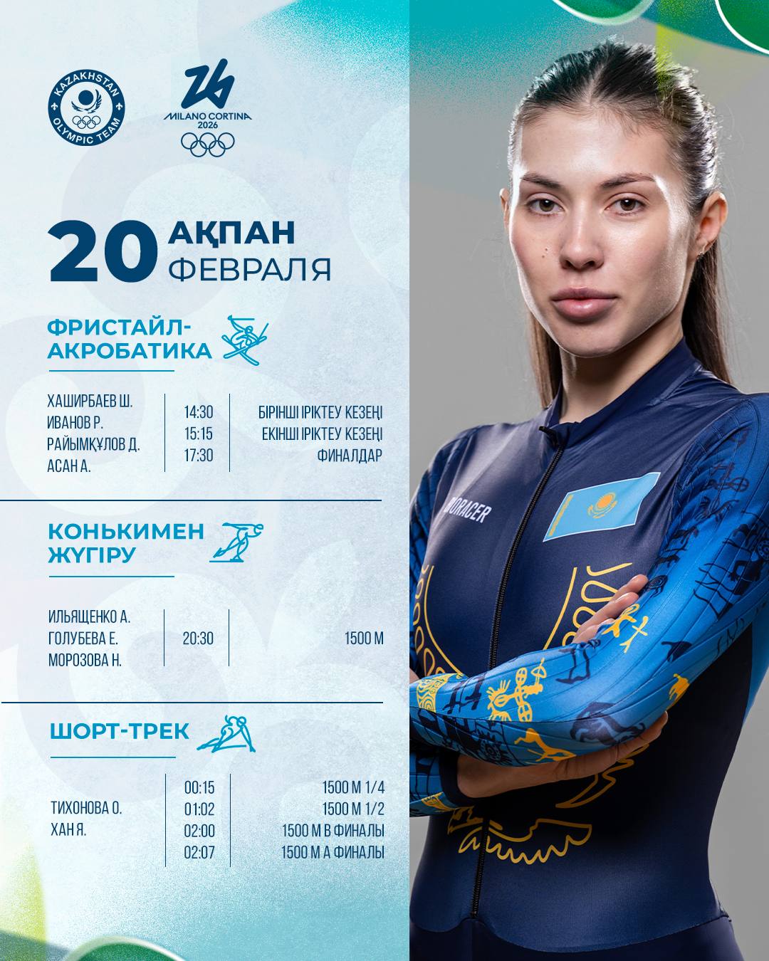 2026 жылғы Милан/Кортина-д’Ампеццо (Италия) қалаларында өтетін қысқы Олимпиада ойындары аясында Қазақстан құрамасының 20 ақпандағы жарыс кестесі (Астана уақыты бойынша).