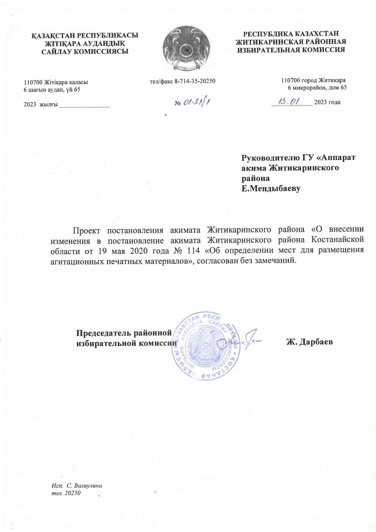 «О внесении изменения в постановление акимата Житикаринского района Костанайской области от 19 мая 2020 года № 114 «Об определении мест для размещения агитационных печатных материалов» |