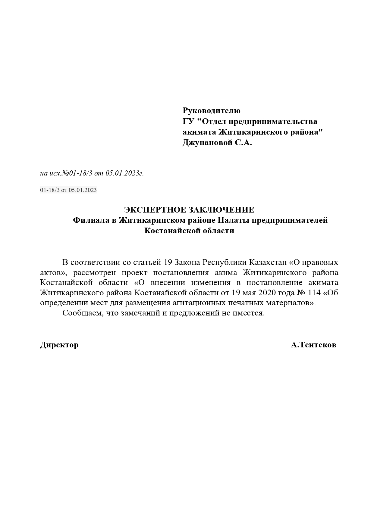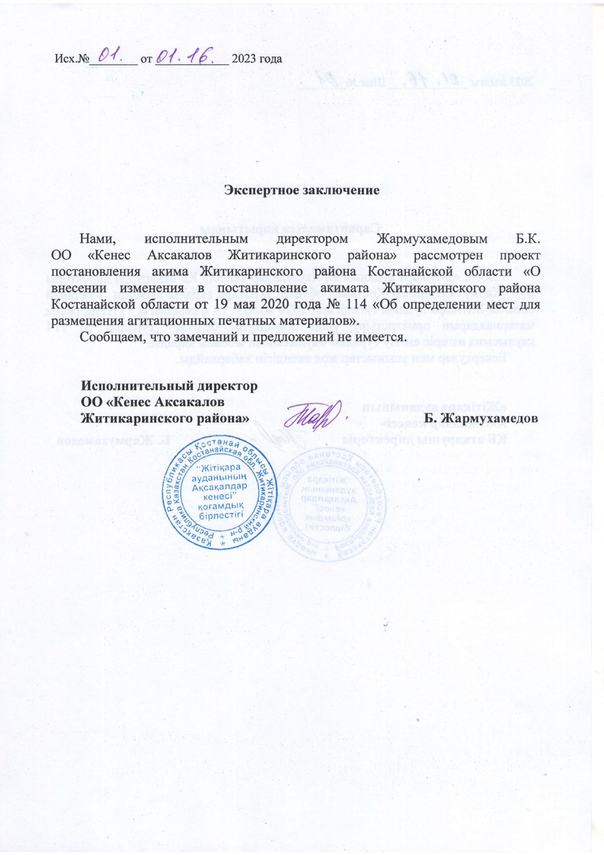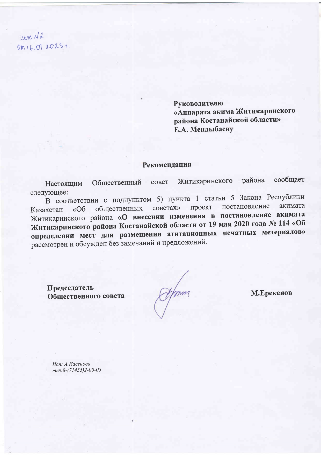 Постановление акимата Житикаринского района Костанайской области от 19 мая 2020 года № 114 «Об определении мест для размещения агитационных печатных материалов» |