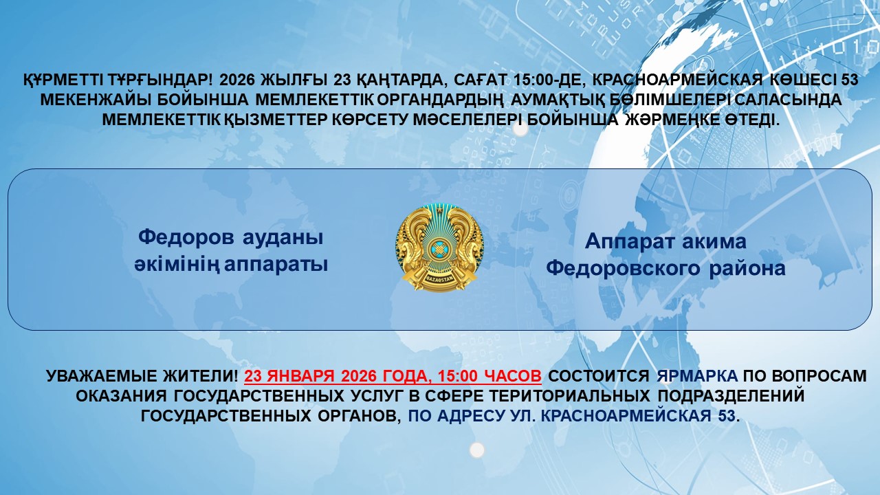 ҚҰРМЕТТІ ТҰРҒЫНДАР! 2026 ЖЫЛҒЫ 23 ҚАҢТАРДА, САҒАТ 15:00-ДЕ, КРАСНОАРМЕЙСКАЯ КӨШЕСІ 53 МЕКЕНЖАЙЫ БОЙЫНША МЕМЛЕКЕТТІК ОРГАНДАРДЫҢ АУМАҚТЫҚ БӨЛІМШЕЛЕРІ САЛАСЫНДА МЕМЛЕКЕТТІК ҚЫЗМЕТТЕР КӨРСЕТУ МӘСЕЛЕЛЕРІ БОЙЫНША ЖӘРМЕҢКЕ ӨТЕДІ.