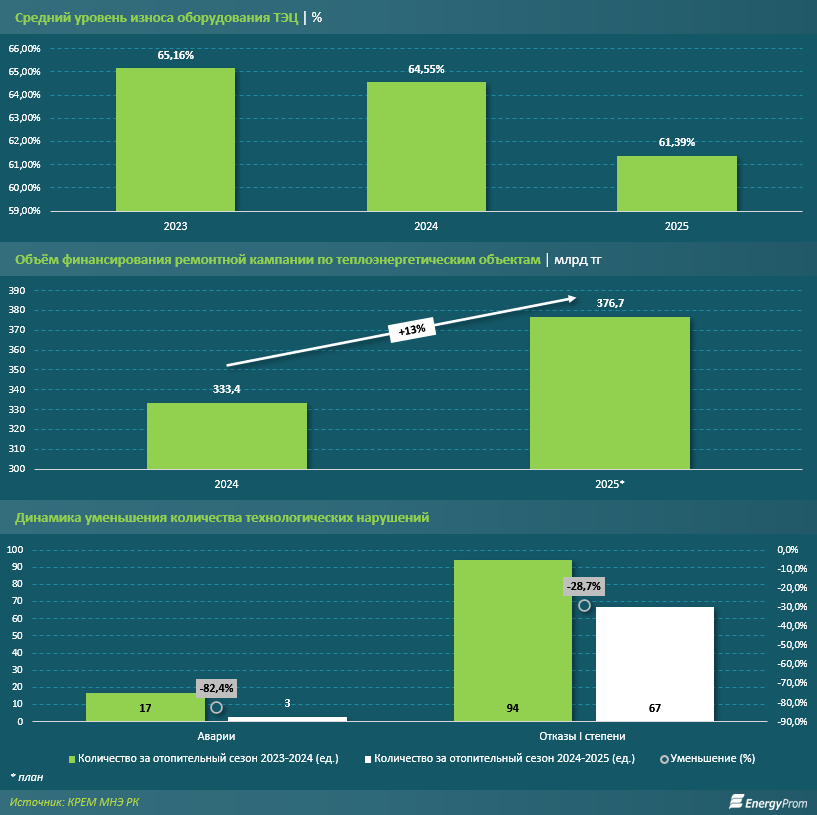 Теплоснабжение Казахстана работает на инфраструктуре с уровнем износа в 52%, при охвате всего 60% городов и протяжённости сетей около 13 тыс. км (из них 11 тыс. км — коммунальные, 2 тыс. км — частные сети). Такая база не обеспечивает устойчивого роста потребления и ограничивает подключение новых производств. Национальный проект предусматривает замену 1622 км изношенных сетей и строительство новых линий, критически важных для повышения пропускной способности и снижения потерь. Без этих мощностей экономика столкнётся с ограничениями по размещению индустриальных объектов и ростом затрат.