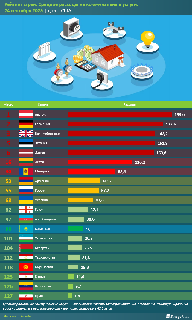 Тем временем самые значительные суммы в мире на ЖКУ тратят жители ведущих европейских стран: в Великобритании на 24 сентября 2025 года средние месячные расходы на коммунальные услуги составили 162,2 долл. США, в Германии — 177,6 долл. США, в Австрии — 193,6 долл. США.