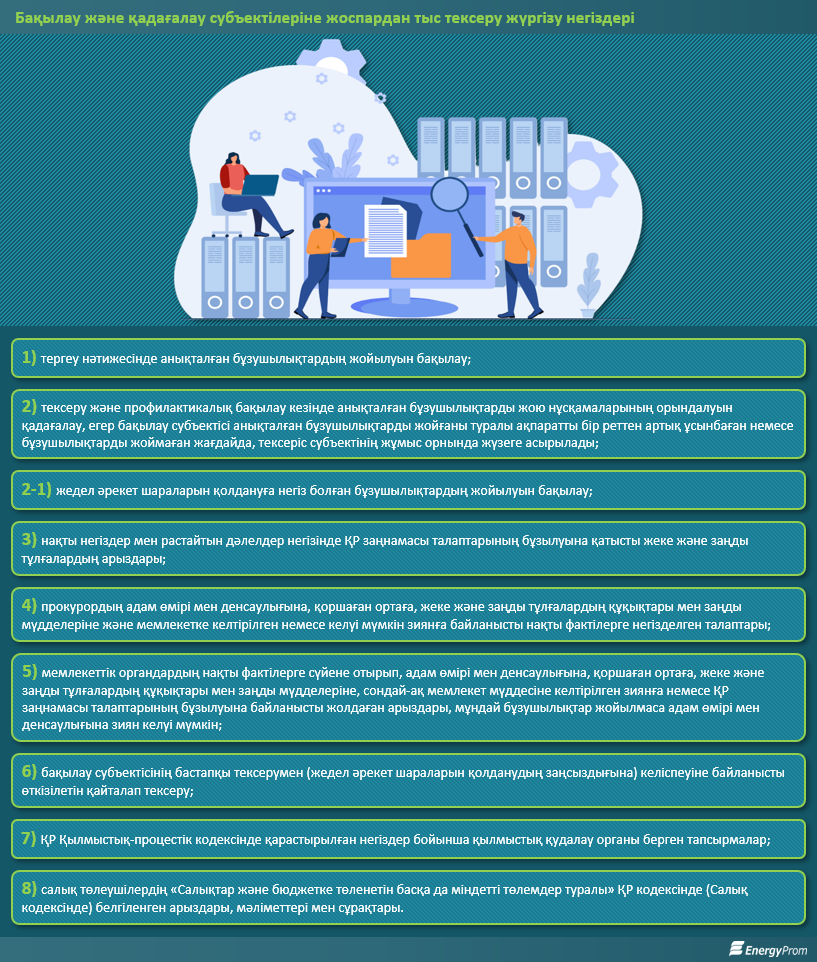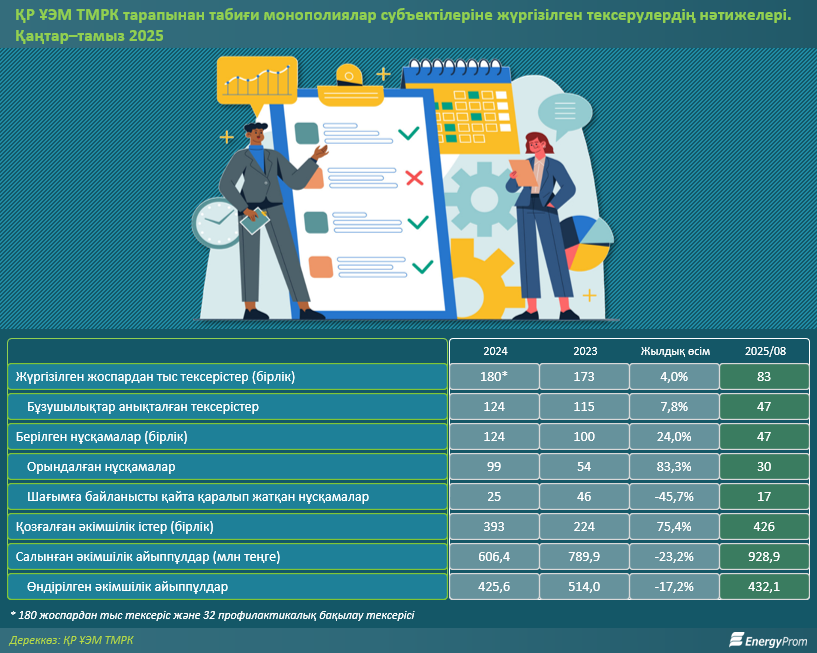 Мәлімет үшін: 2024 жылы жалпы 180 жоспардан тыс тексеріс және 32 профилактикалық бақылау тексерісі жүргізілді, нәтижесінде 124-тен бұзушылықтар анықталды (2023 жылмен салыстырғанда, 7,8%-ға көп). Берілген нұсқамалар саны 24%-ға өсіп, 124-ке жетті, оның 99-ы орындалды (плюс 83,3%).
