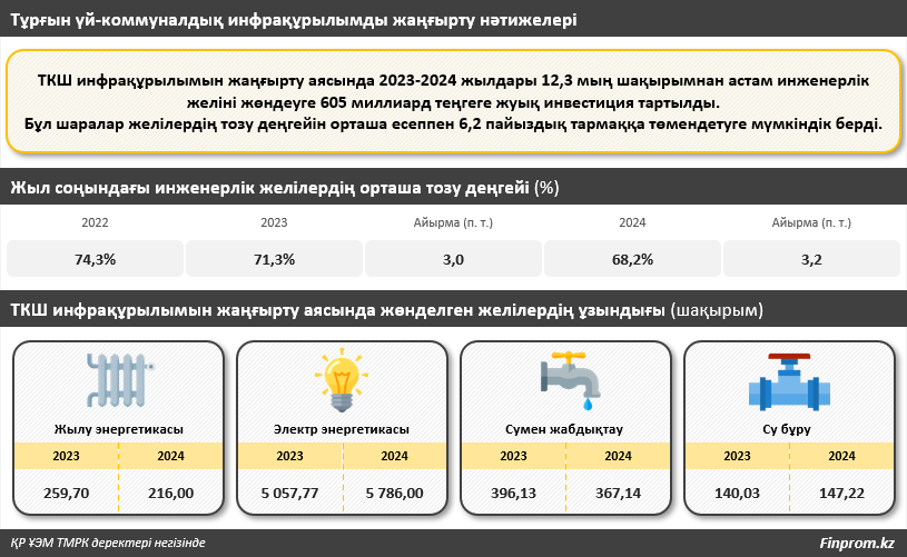 Жалпы алғанда, сауатты тарифтік саясат пен қабылданған шаралар қазірдің өзінде айтарлықтай нәтижелерге жеткізді. Мәселен, ҚР Ұлттық экономика министрлігі Табиғи монополияларды реттеу комитетінің мәліметтері бойынша 2023-2024 жылдары ТКШ инфрақұрылымын жаңғырту аясында 12,3 мың шақырымнан астам инженерлік желіні жөндеуге 605 млрд теңгеге жуық инвестиция тартылды. Бұл шаралар қазірдің өзінде желілердің тозу деңгейін орташа есеппен 6,2 пайыздық тармаққа төмендетуге мүмкіндік берді. Аймақтар мен желілердің түрлері туралы толығырақ инфографика мен кестеде келтірілген.