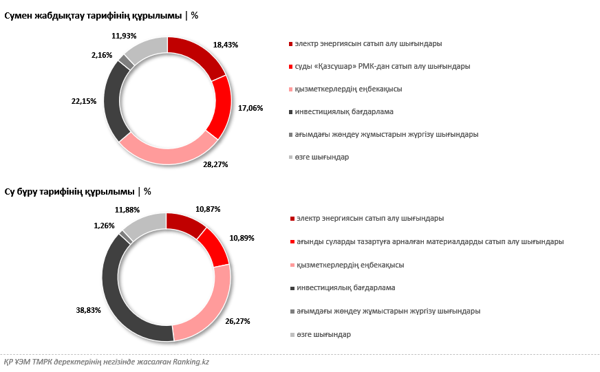 Яғни, жылумен жабдықтау үшін төленген әрбір 100 теңгенің 60 теңгесі жылу энергиясын өндіруге жұмсалады, 37 теңгесі оны тұтынушыға дейін жеткізуге кетеді, ал қалған 3 теңге сату шығындарын құрайды. Осы қағидат бойынша әрі қарай басқа да реттелетін коммуналдық қызметтер тарифтерінің қалай белгіленетінін көрсетеміз.