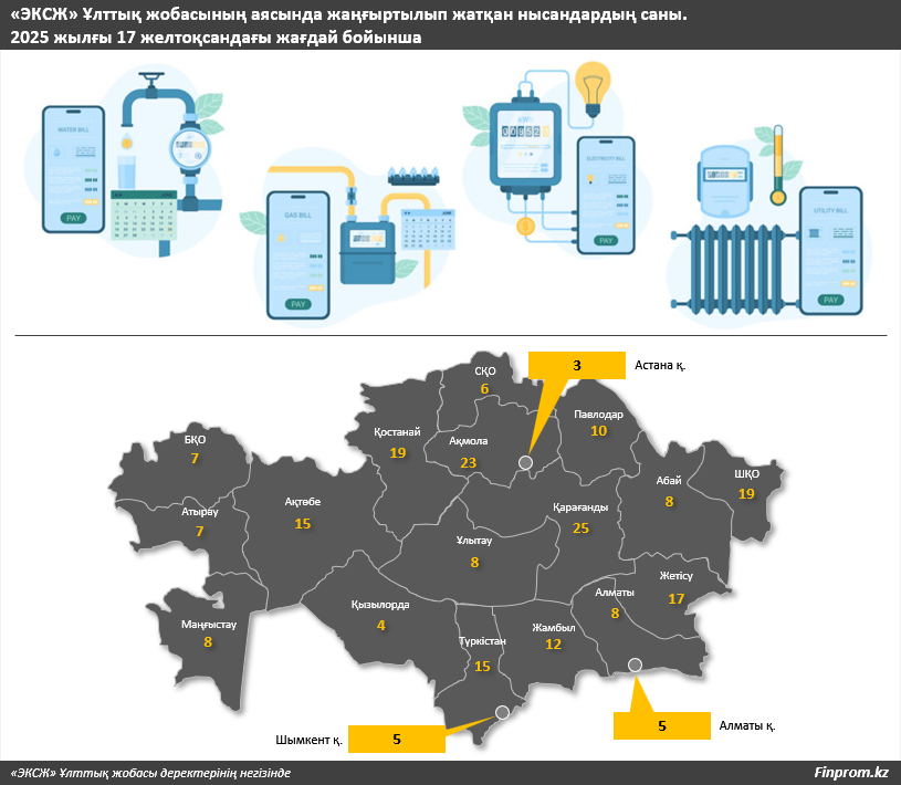 «Тұрғын үй-коммуналдық шаруашылығын жаңғырту мен дамытудың қазақстандық орталығы» АҚ-ның 2025 жылғы 15 желтоқсандағы деректеріне сәйкес «ЭКСЖ» жобасына қатысуға еліміздің барлық өңірлерінде орналасқан 267 нысан бойынша өтінім берілген.