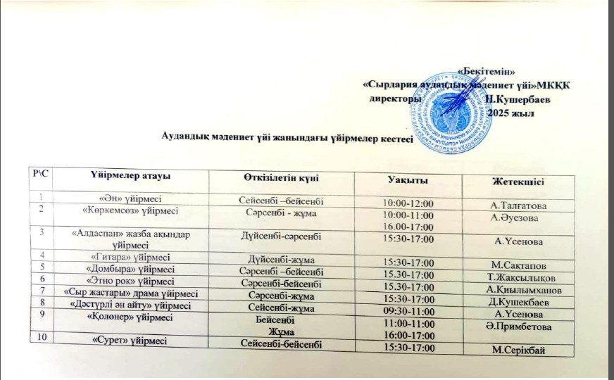 График проведения кружков при Сырдарьинском районном Доме культуры /2025год /