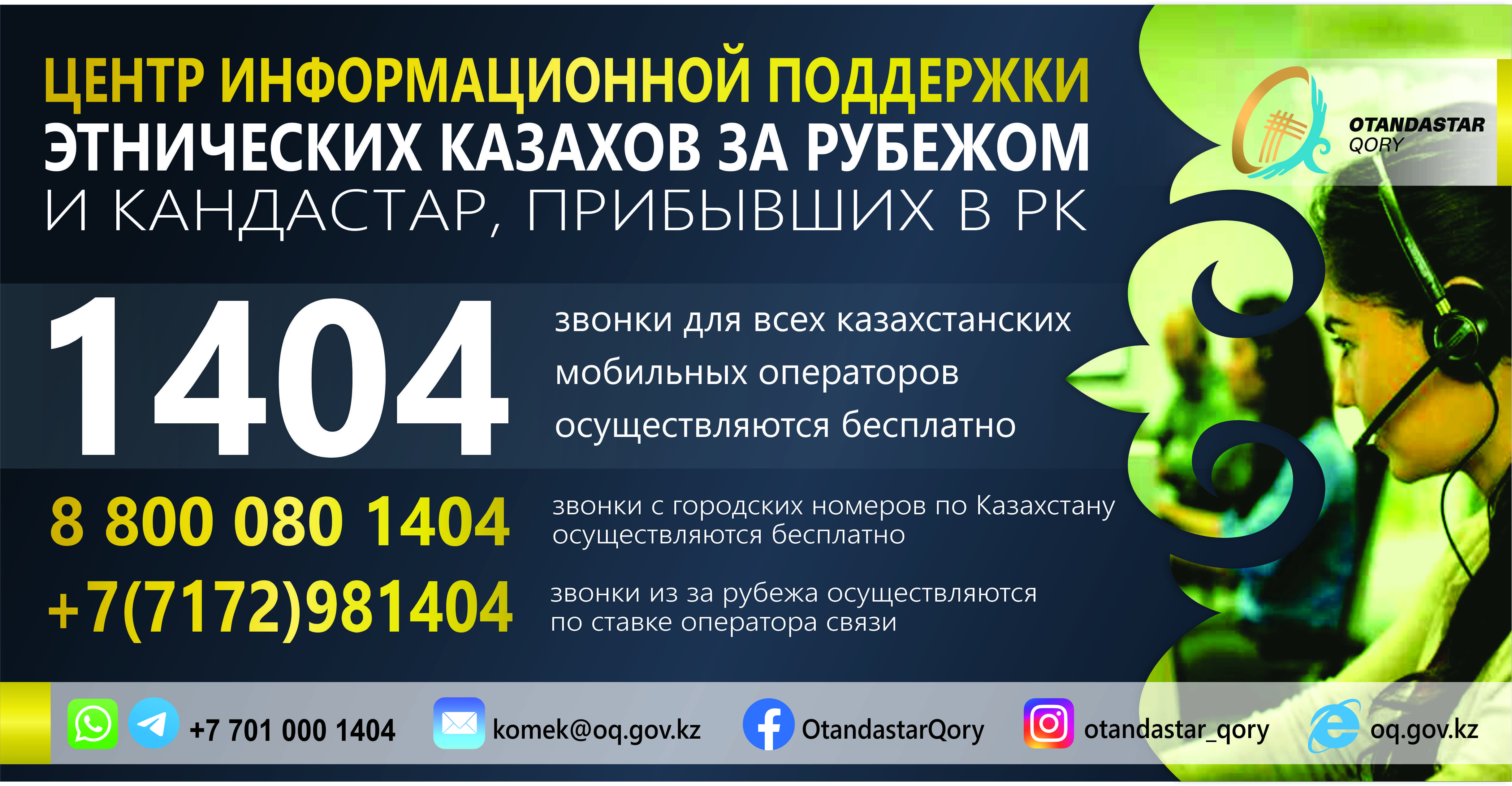 1404 (для мобильных телефонов), 8-800-080-1404 (для звонков по Казахстану), +7 (7172) 981404 (для звонков из-за границы), + 7 701 000 14 04 (WhatsApp, Telegram), E-mail: komek@ oq.gov.kz , Skype: komek@oq.gov.kz .