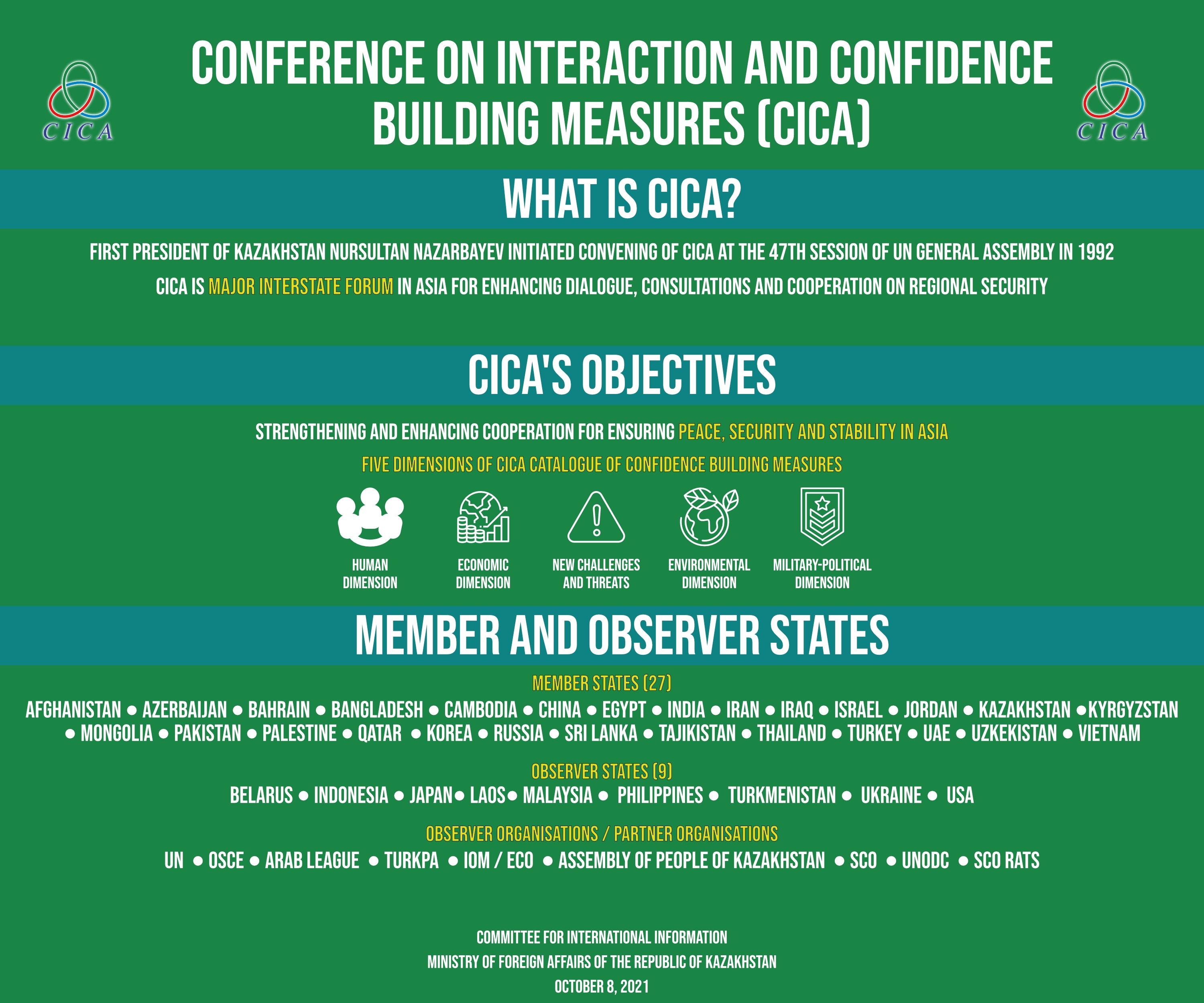 The Conference on Interaction and Confidence Building Measures in Asia (CICA) is an interstate forum for enhancing cooperation towards promoting peace, security, and stability in Asia. The organization includes 27 member states, 9 observer states, 5 observer organizations, and 5 partner organizations, making it the major forum in Asia covering more than 50 percent of the world’s population.