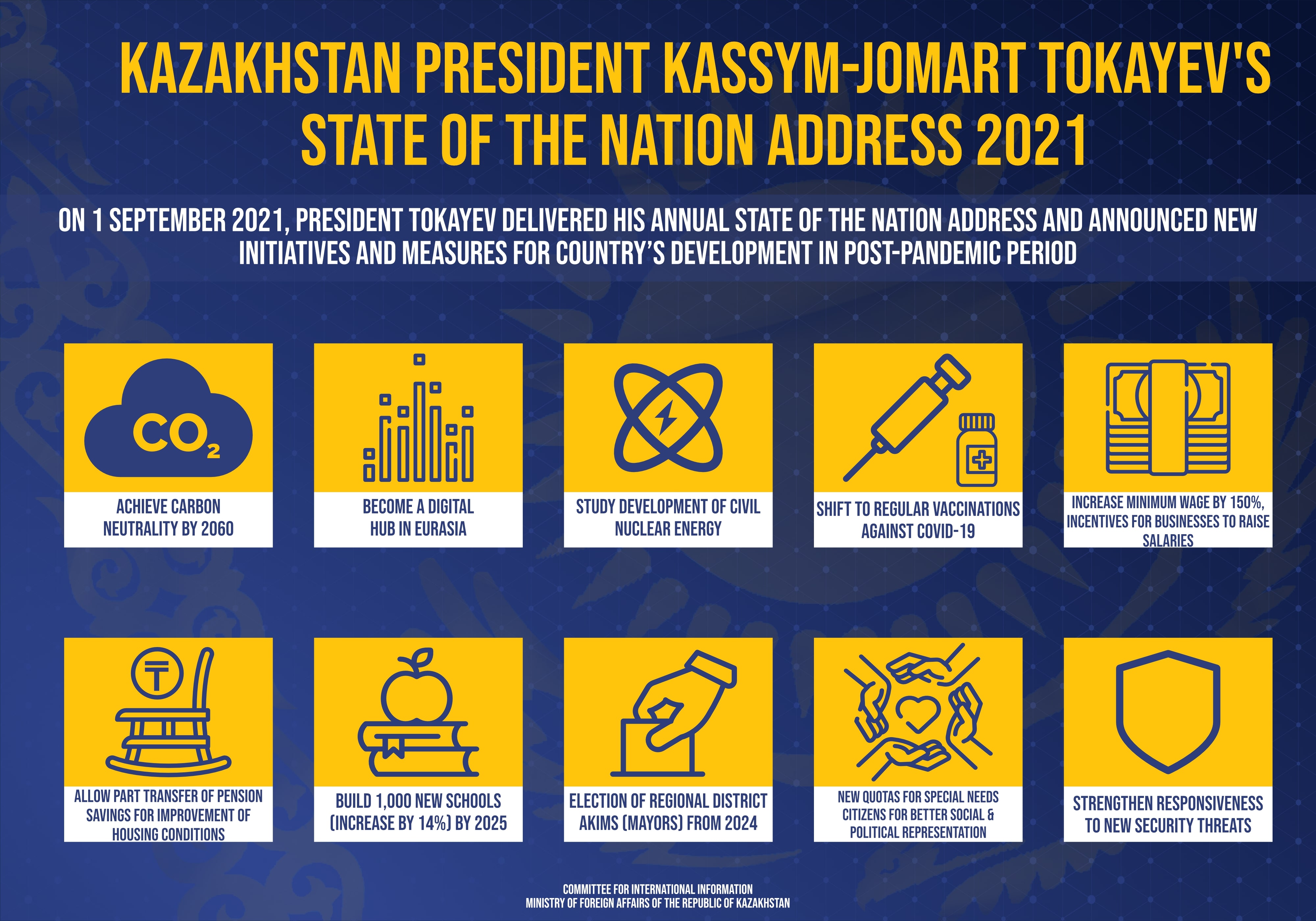On 1 September, 2021, President Kassym-Jomart Tokayev delivered his annual State of the Nation Address and announced a number of initiatives focused on the post-pandemic development of the nation. The reforms include increasing the efficiency of the healthcare system, providing quality education, improving regional policy, creating an effective ecosystem in the labour market, political modernisation, protecting human rights and consolidating society.