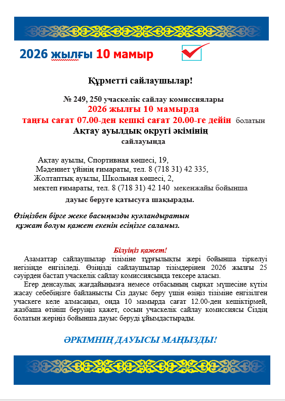 Құрметті сайлаушылар! № 249, 250 учаскелік сайлау комиссиялары 2026 жылғы 10 мамырда таңғы сағат 07.00-ден кешкі сағат 20.00-ге дейін болатын Ақтау ауылдық округі әкімінің сайлауында