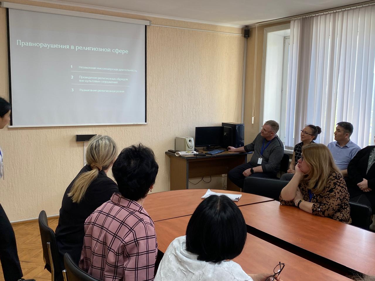 Кездесудің бірінші бөлімінде қатысушыларға дін саласындағы заңнама жағдайы туралы өзекті ақпарат ұсынылды. Спикер діни бірлестіктер қызметін реттейтін құқықтық нормалар мен осы саладағы құқық бұзушылықтар үшін жауапкершілік туралы кеңінен түсіндіріп берді.