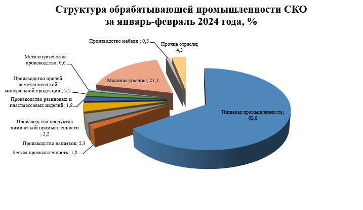 В обрабатывающей промышленности, занимающей наибольшую долю в структуре промышленного производства (76%), за январь-февраль 2024 года произведено продукции на 69 686,3 млн. тенге ИФО – 107,3%.