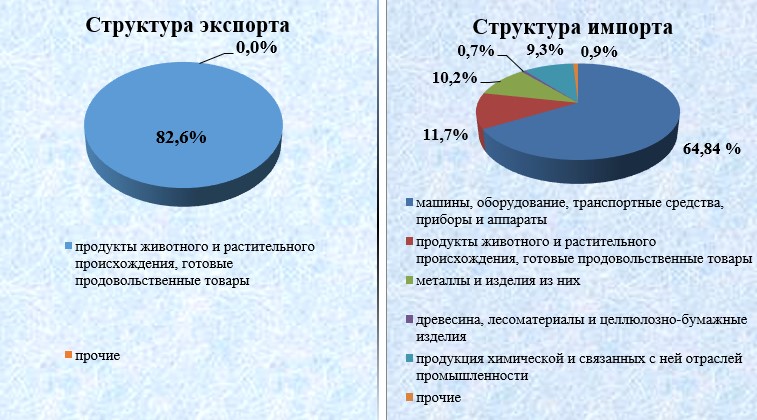 В экспортных поставках наибольшую долю занимают продукты следующих товарных групп: «Продукты животного и растительного происхождения, готовые продовольственные товары» - 82,6% от всего объема экспорта или 15,7 млн. долларов США.