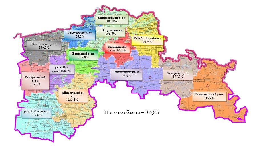 Индекс физического объема промышленной продукции по Северо-Казахстанской области в разрезе районов за январь-февраль 2024 года