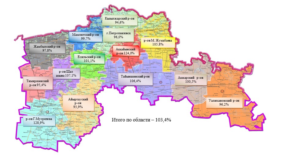 Индекс физического объема валовой продукции сельского, лесного и рыбного хозяйства по Северо-Казахстанской области в разрезе районов за январь-февраль 2024 года