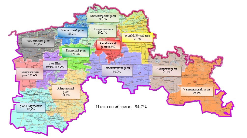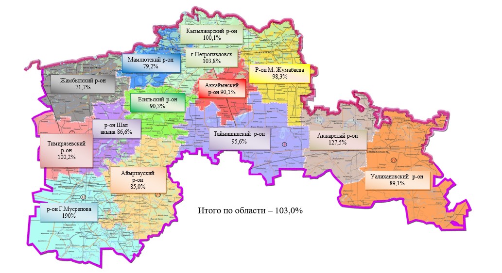 Строительство медицинского пункта, расположенного по адресу Северо-Казахстанская область, Аккайынский район, Ивановский сельский округ, с. Ивановка, ул. 9 мая, строение 6 – 26,9 млн. тенге. Освоение составило 21,5 млн. тенге.