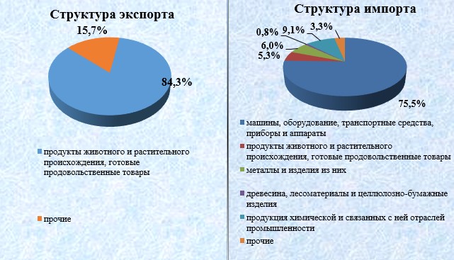 В экспортных поставках наибольшую долю занимают продукты следующих товарных групп: «Продукты животного и растительного происхождения, готовые продовольственные товары» - 84,3% от всего объема экспорта или 133,0 млн. долларов США.