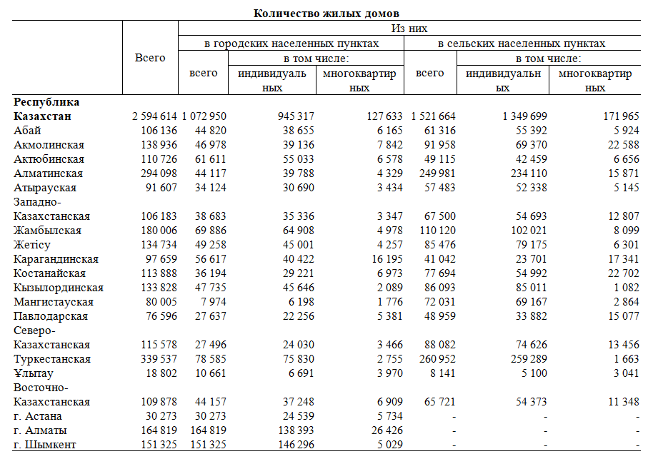 Самое большое количество жилых домов в Туркестанской и Алматинской областях, по 339,5 тыс. и 294 тыс. единиц соответственно. Среди городских населенных пунктов самое большое количество жилья в городе Алматы –164,8 тыс. единиц, среди сельской в Туркестанской области – 260,9 тыс. единиц.