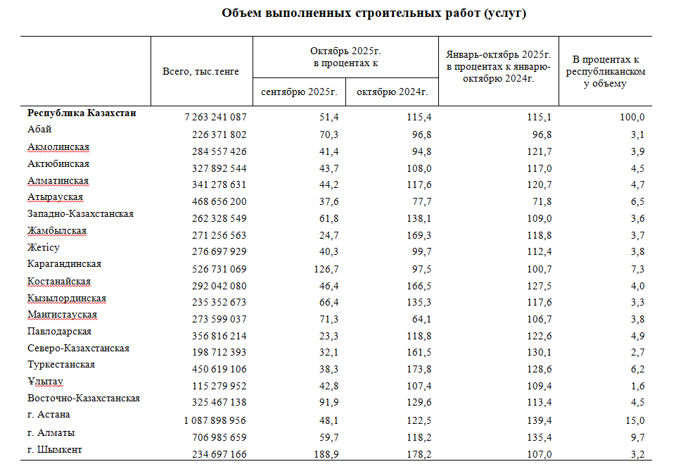 В январе-октябре 2025г. объем строительных работ увеличился на 15,1% и составил 7 263,2 млрд тенге. Увеличение объема строительных работ связано с работами по строительству и ремонту сооружений (на 19,2%), нежилых (на 10,2%) и жилых зданий (на 7,6%).