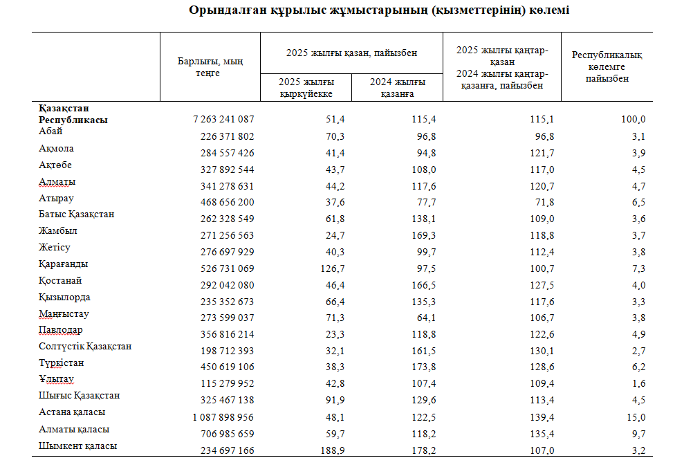 2025 жылғы қаңтар-қазанда орындалған құрылыс жұмыстарының көлемі 15,1% өсіп, 7263,2 млрд. теңгені құрады.