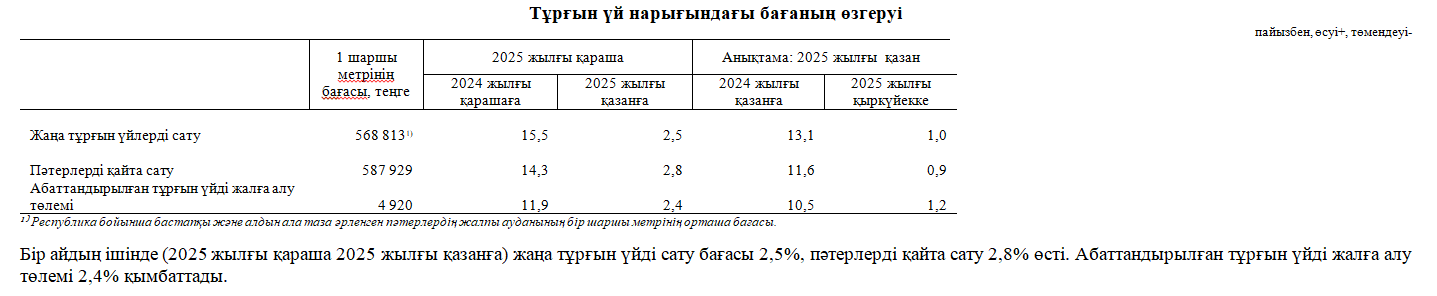 Бір жылда (2025 жылғы қараша 2024 жылғы қарашаға) жаңа тұрғын үйлерді сату бағасы 15,5%, қайталама нарықта пәтерлерді қайта сату бағалары 14,3% жоғарылады. Абаттандырылған тұрғын үйді жалға алу төлемі 11,9% өсті.