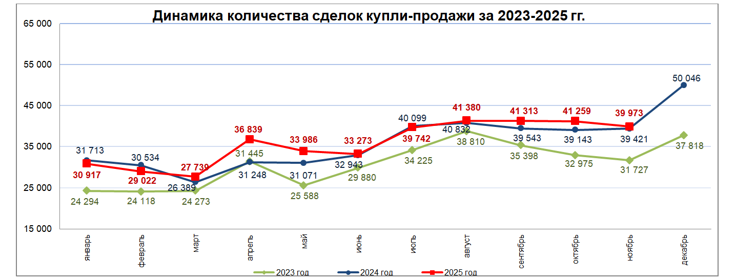 Количество сделок купли-продажи жилья за ноябрь 2025 года по сравнению с соответствующим месяцем прошлого года увеличилось на 1,4%, тогда было зарегистрирована 39 421 сделка. Наибольший рост сделок был отмечен в области Жетісу (31,3%), наибольшее снижение – в области Ұлытау (-31%). Увеличение наблюдается в количестве сделок за январь-ноябрь 2025 года по сравнению c январем-ноябрем 2024 года, что составляет 3,3%.