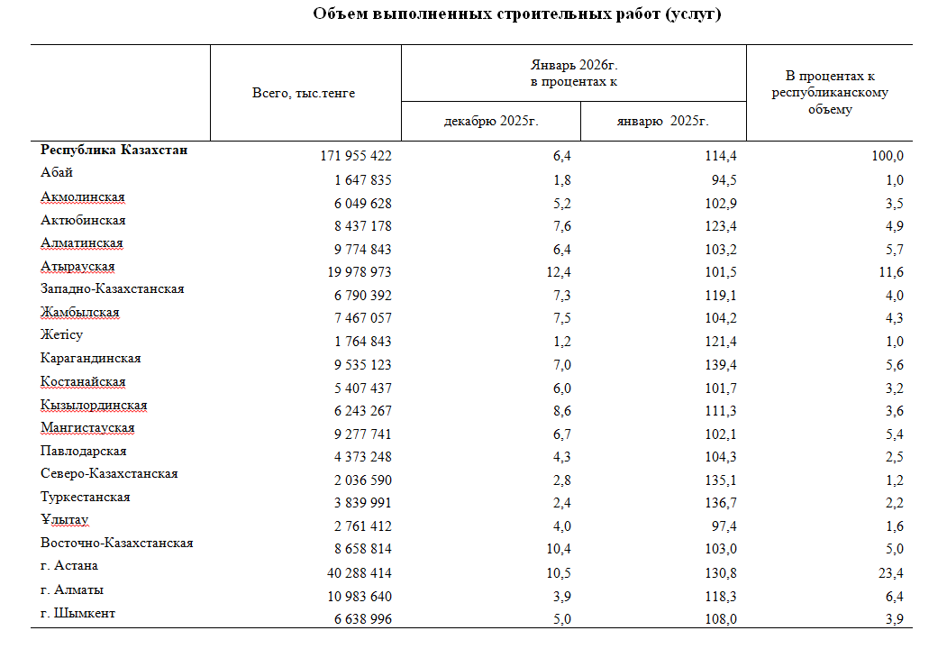 В январе 2026 г. объем строительных работ увеличился на 14,4% и составил 172 млрд тенге. Увеличение объема строительных работ связано с работами по строительству и ремонту жилых зданий (в 2,2 раза) и сооружений (на 57,8%).