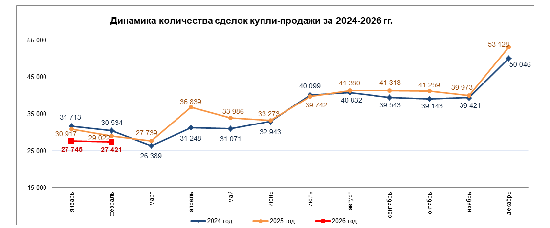 Количество сделок купли-продажи жилья за февраль 2026г. по сравнению с соответствующим месяцем прошлого года уменьшилось на 5,5%, тогда было зарегистрировано 29 022 сделки. Наивысший рост сделок был отмечен в Атырауской (14%) области, наибольшое снижение – в области Ұлытау (-30,3%). Уменьшение наблюдается в количестве сделок за январь-февраль 2026 года по сравнению c январем-февралем 2025 года – на 8%.