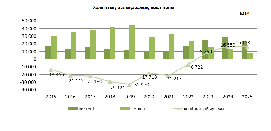2025 жылы Қазақстанға тұрақты тұруға 23 761 адам келді, ал кеткендердің саны 7 608 адамды құрады. Сыртқы көші-қонның сальдосы оң – 16 153 адам. Осылайша елімізде қатарынан үшінші жыл көші-қонның оң сальдосы байқалып отыр.