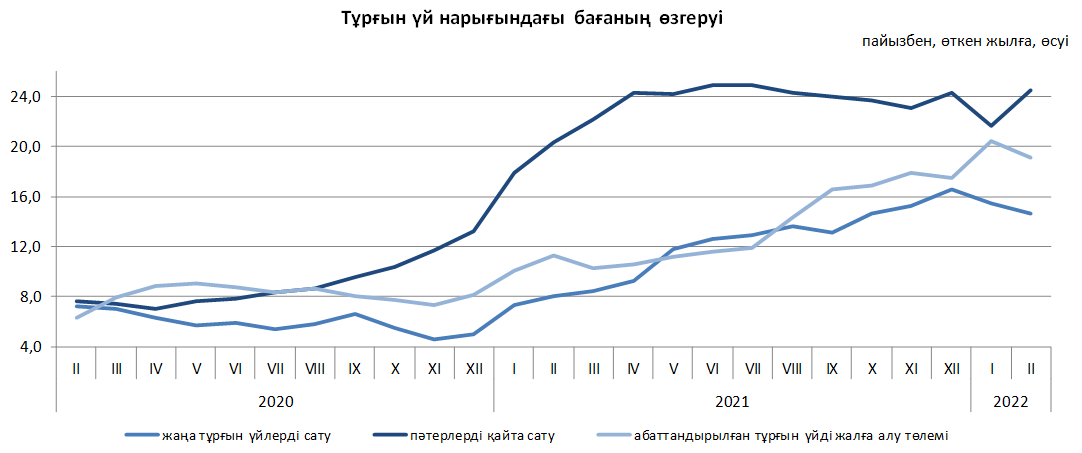 Бір айда (2022 жылғы ақпан 2022 жылғы қаңтарға) пәтерлерді қайта сату бағаларына өсу қарқыны 2021 жылғы ақпанда 3,1%-дан 2022 жылғы ақпанда 5,5% байқалды. Жаңа тұрғын үйлерді сату бағалары бір айда 0,4% өсті, бұл 2021 жылғы ақпаннан 0,8 пайыздық тармаққа төмен, абаттандырылған тұрғын үйді жалға алу төлемі – тиісінше 0,6% және 1 пайыздық тармаққа.
