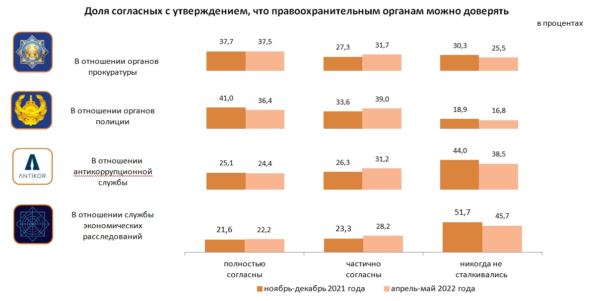Так, на вопрос «Согласны ли вы с утверждением, что правоохранительным органам можно доверять» выбрали вариант «Полностью согласны»: в отношении органов прокуратуры 37,5% опрошенных, в отношении полиции – 36,4%, в отношении антикоррупционной службы – 24,4%, в отношении службы экономических расследований – 22,2%. При этом, 45,7% и 38,5% ответивших никогда не сталкивались со службой экономических расследований и антикоррупционной службой соответственно.