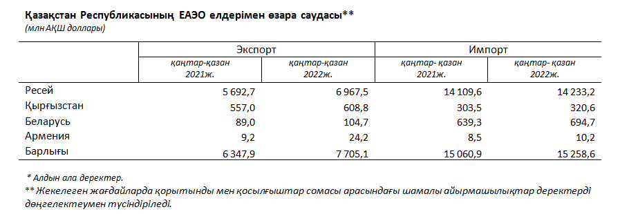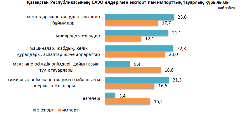 Қазақстан Республикасының ЕАЭО елдерімен сыртқы сауда айналымының жалпы көлемінде Ресей Федерациясына – 92,3%, бұдан әрі Қырғызстан Республикасына – 4%, Беларусь Республикасына – 3,5%, Армения Республикасына – 0,2% келеді.