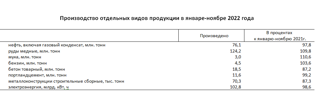По сравнению с январем-ноябрем 2021г. отмечается рост объемов добычи руд цветных металлов (105,9%), производства напитков (110,1%), табачных изделий (109,8%), легкой промышленность (106,9%), химической (109,4%) и металлургической промышленности (103,9%), резиновых и пластмассовых изделий (102,9%).