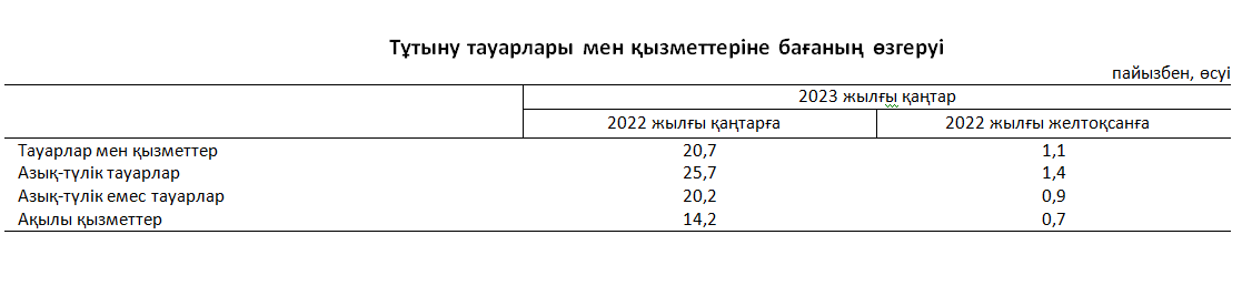 Бір айлық мәнде тұтыну бағаларының индексі 2023 жылғы қаңтарда 1,1% құрады. Өткен айда азық-түлік тауарлары – 1,4%, азық-түлікке жатпайтын тауарлар – 0,9%, ақылы қызметтер 0,7% өсті.