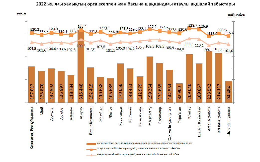 2022 жылы халықтың орта есеппен жан басына шаққандағы атаулы ақшалай табыс мөлшері бойынша ең жоғары мән Атырау облысында (315 448 теңге), ең төменгі мән Түркістан облысында (82 900 теңге) байқалды.