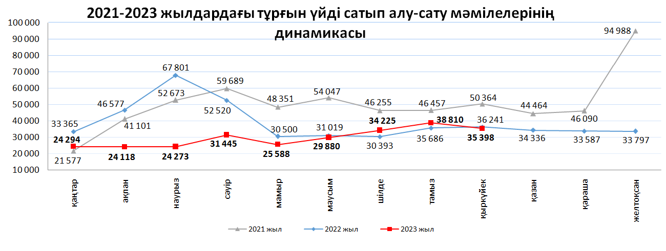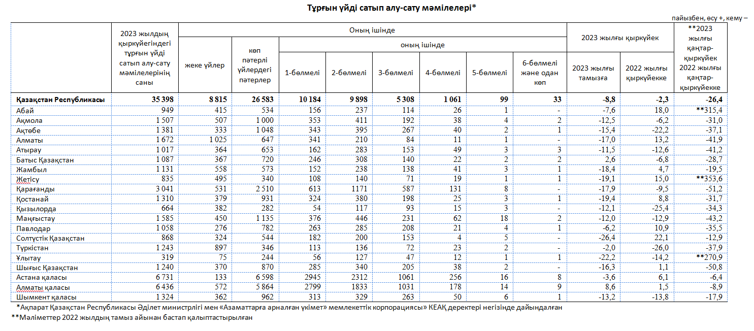2023 жылдың қыркүйегінде тұрғын үйді сатып алу-сату мәмілелері алдыңғы жылдың тиісті айымен салыстырғанда 2,3%-ға азайған, ол кезде 36 241 мәміле ресімделген болатын. Азаюдың ең жоғарғы көрсеткіші Түркістан облысында (26%-ға) тіркелді, ал Солтүстік-Қазақстан облысында ұлғаюдың ең үлкен көрсеткіші (22,1%-ға) байқалды. Теріс динамика 2023ж. қаңтар-қыркүйек айларындағы мәмілелер санының 2022ж. қаңтар-қыркүйек айларындағы мәмілелер санымен салыстырғанда орын алды және -26,4%-ды құрады.