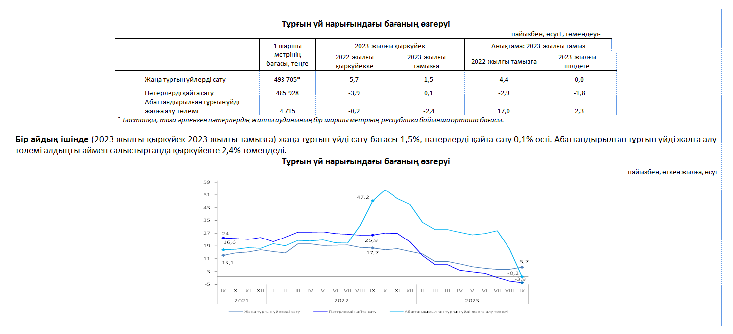 Бір жылда (2023 жылғы қыркүйек 2022 жылғы қыркүйекке) жаңа тұрғын үйлерді сату бағасы 5,7% өсті, ал пәтерлерді қайта сату бағасы керісінше 3,9% төмендеді. Абаттандырылған тұрғын үйді жалға алу төлемі де өткен жылғы тиісті аймен салыстырғанда 2023 жылғы қыркүйекте 0,2% төмендеді.