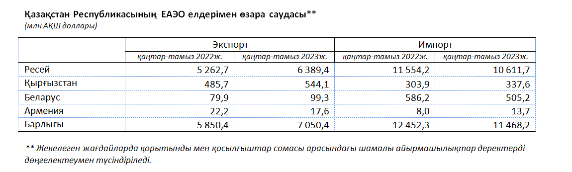 2023 жылғы қаңтар-тамызда Қазақстан Республикасының ЕАЭО елдерімен өзара сауда 18 518,7 млн АҚШ долларын құрап, өткен жылдың сәйкес кезеңімен салыстырғанда номиналды мәнде 1,2%* көбейді.