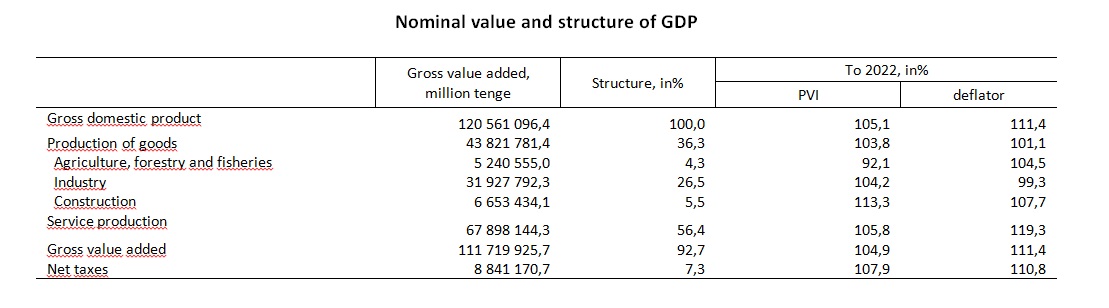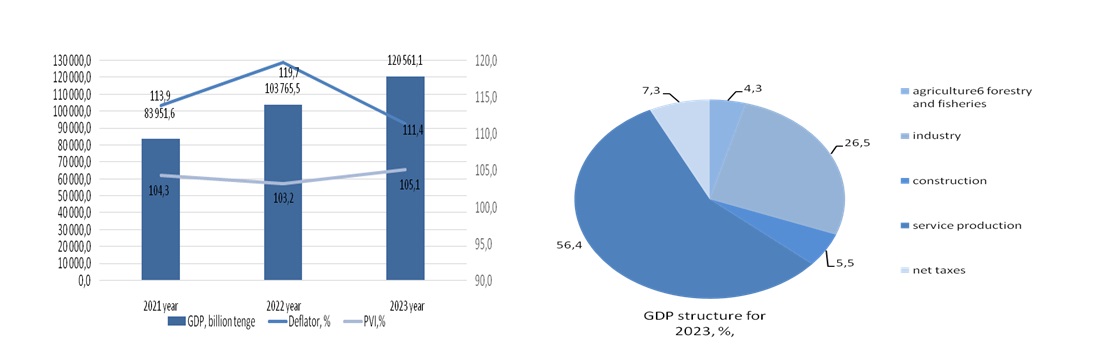 The physical volume index (PVI) of the Gross Domestic Product (GDP) for 2023 (preliminary data) in relation to 2022 amounted to 105,1% and remained at the level of the operational estimate of GDP. In the structure of GDP, the share of production of goods is 36, 3%, services –56,4%.