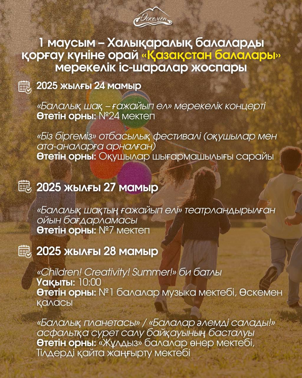 22-30 мамыр аралығында Қазақстанның барлық өңірінде Халықаралық балаларды қорғау күніне арналған ауқымды іс-шаралар өтуде. Биылғы жылы бұл мереке «Қазақстан балалары» атты бірыңғай ұранмен ұйымдастырылып отыр.